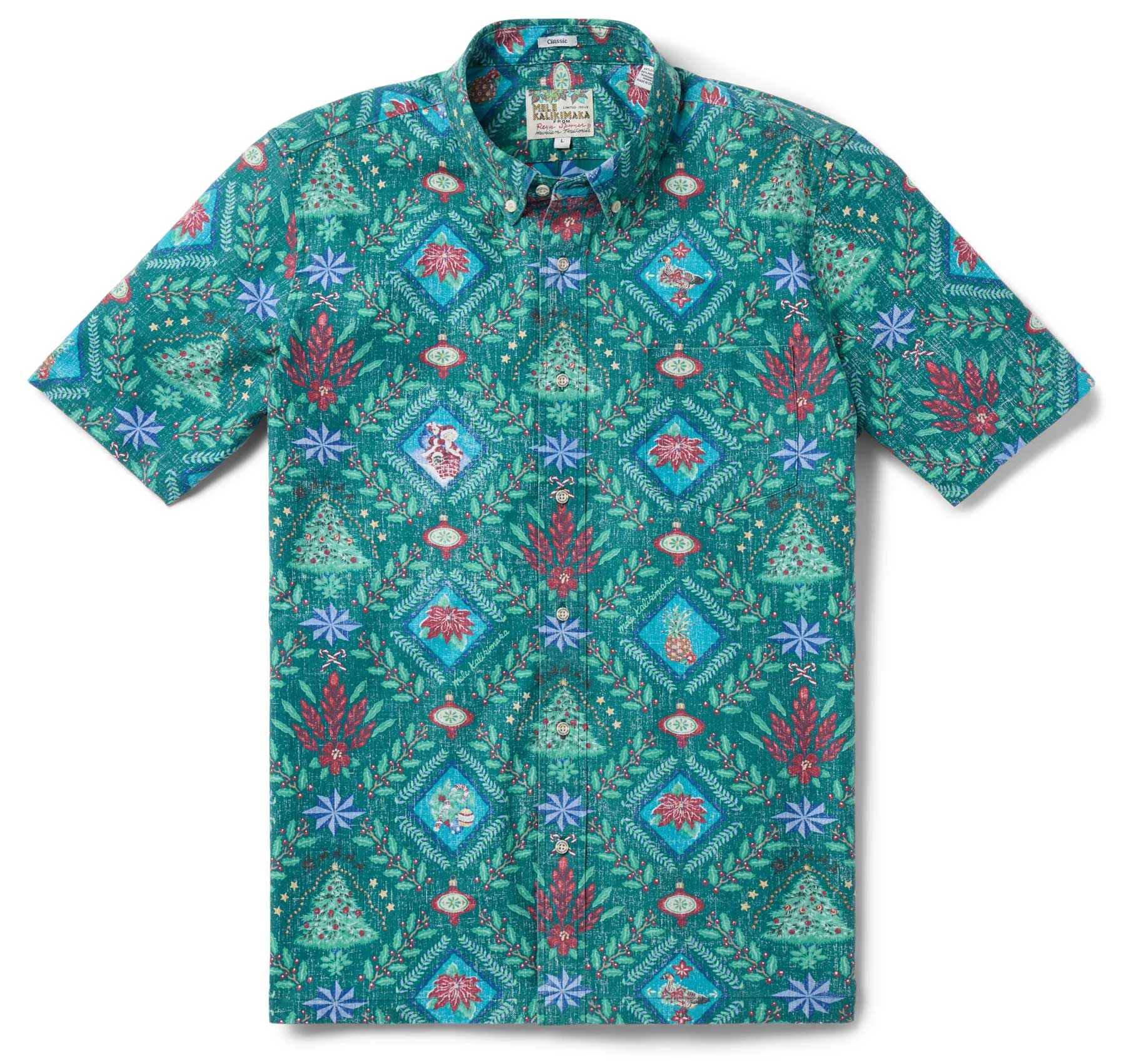 Reyn Spooner designers referenced vintage Hawaiian quilt, patchwork, and embroidery when creating this 2025 Hawaiian Christmas print. The design features holly, hibiscus, poinsettias, and a holiday tree along with Santa and his reindeer. If you look closely, you may spot the year of the print hidden in this design. Mele Kalikimaka!